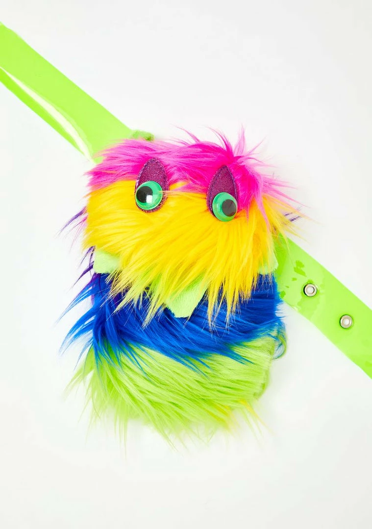 is your perfect dance partner in crime, bb! This neon green vinyl belt bag has a rainbow faux fur monster pouch with cute lil eyes NΓ’ΒΒ teeth, a velcro fastening, and an adjustable buckle closure on the waist.