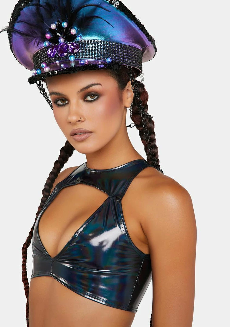 cuz they’re under your spell. This cropped tank top has a holographic stretch vinyl construction, a large keyhole cut-out on the front, and a zipper closure on the back.