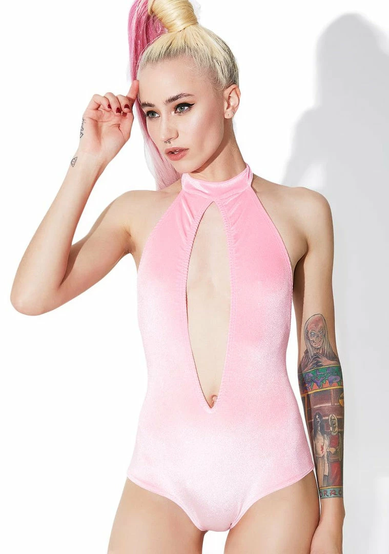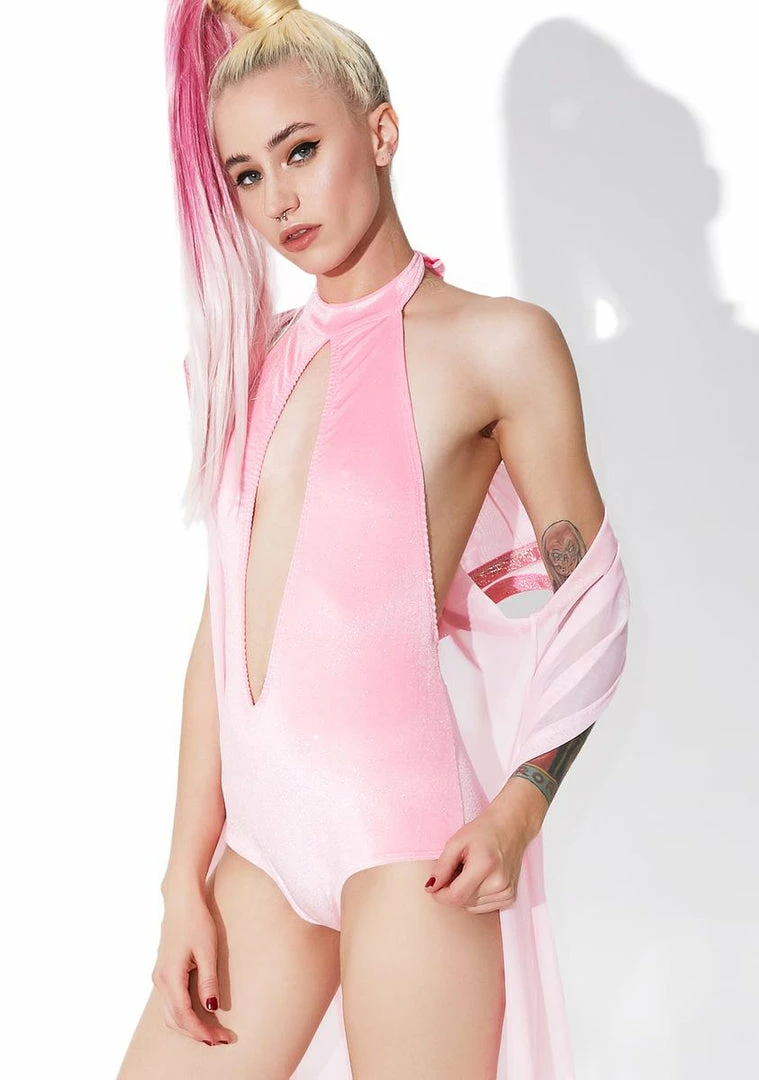 yer lookinΓ’ΒΒ bubblelicious babe! Keep it sugary NΓ’ΒΒ shimmering in this hot pink romper featuring a stretchy velvet construction covered in tiny silver sparkles, keyhole cut-out in front, deep scoop back and high neckline with halter tie closure.