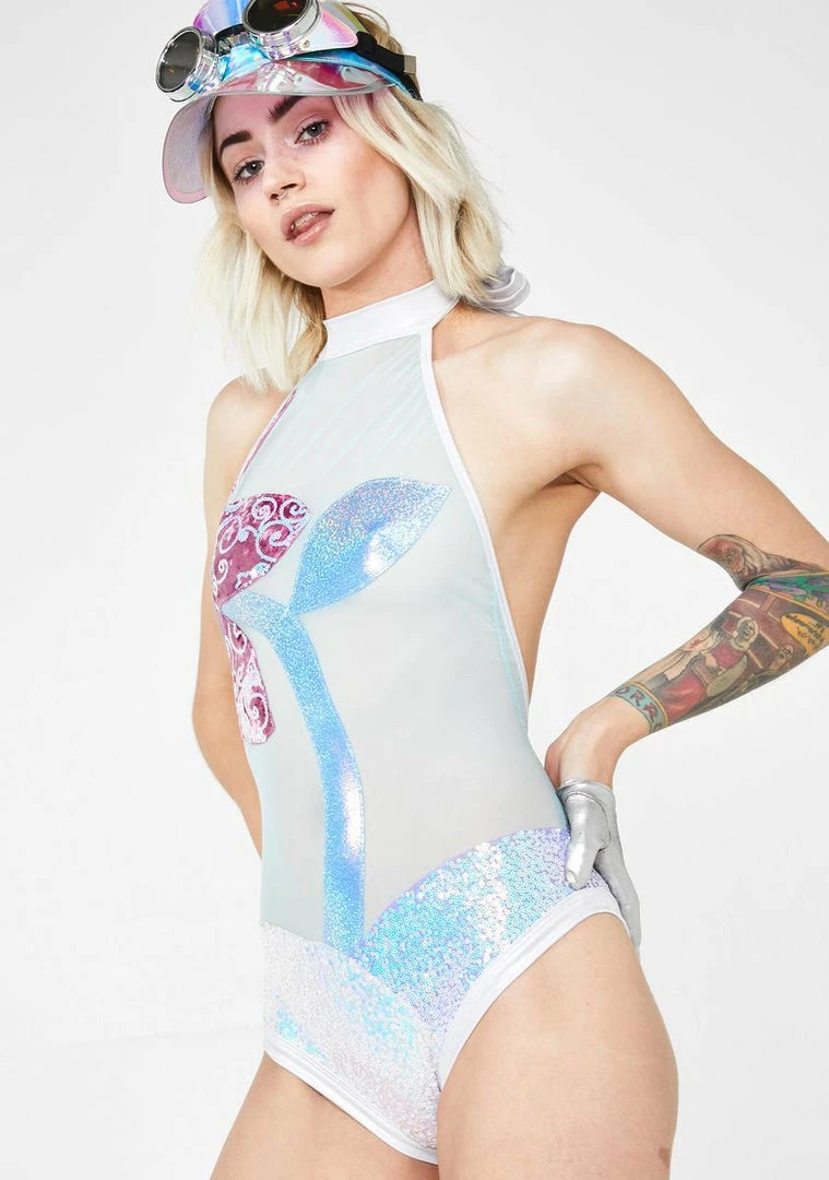 will have ya wanderinΓ’ΒΒ through the cosmic gardens! YouΓ’ΒΒre a blooming beauty in this cute AF sheer bodysuit that has a high halter neckline, an open back, and sequin floral appliques with an iridescent shine.