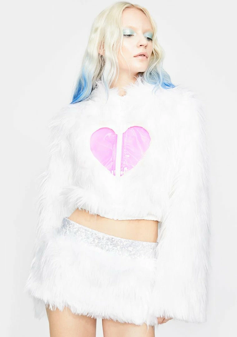 peace, love, unity and respect, that’s how ya live yer lyfe! Trip Γ’ΒΒem out without losing too many brain cells in this rave babe hooded jacket that has a fuzzy faux fur construction, see thru heart design on the front, LED lights embedded throughout and a front zip closure.