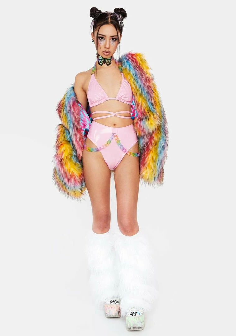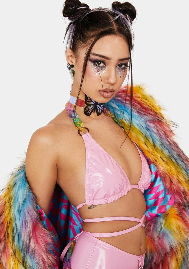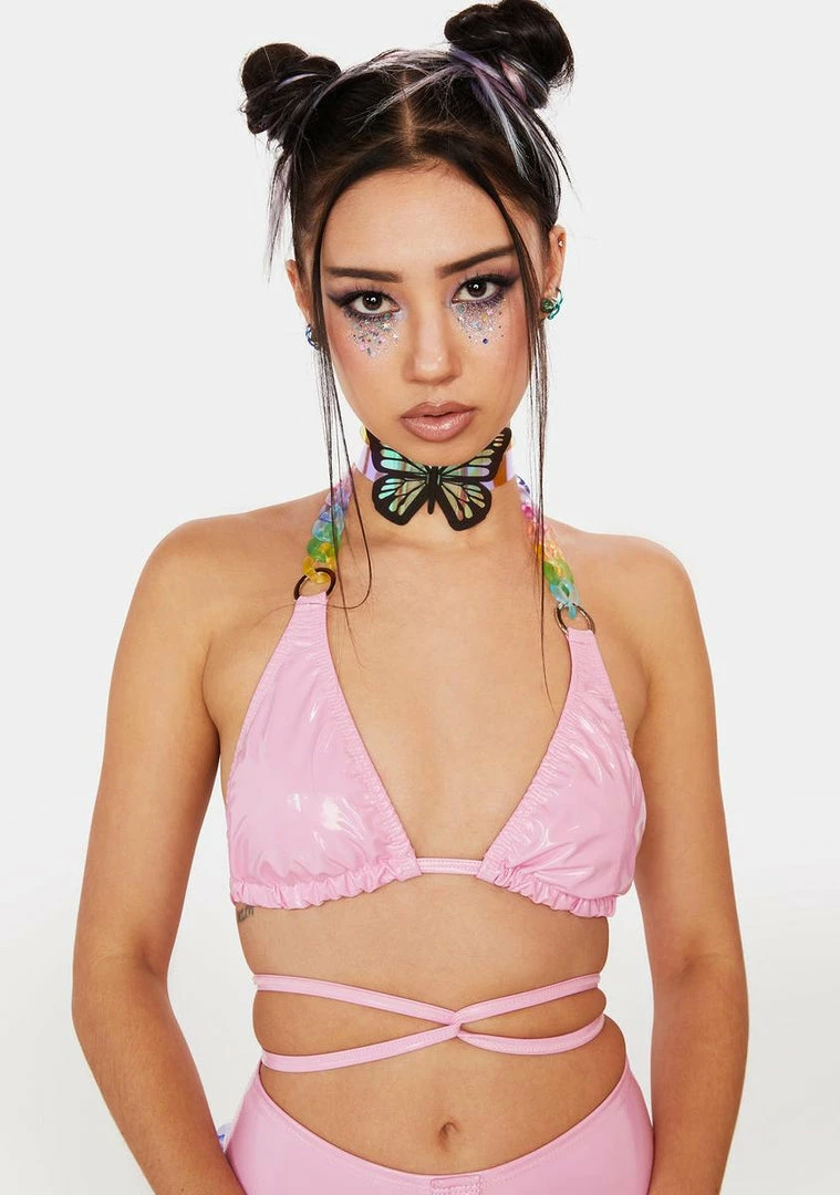 go where the music takes you, babe! This wrap bra top has a stretch vinyl construction, adjustable sliding triangle cups, O-ring hardware with rainbow chains, and adjustable tie back closures.