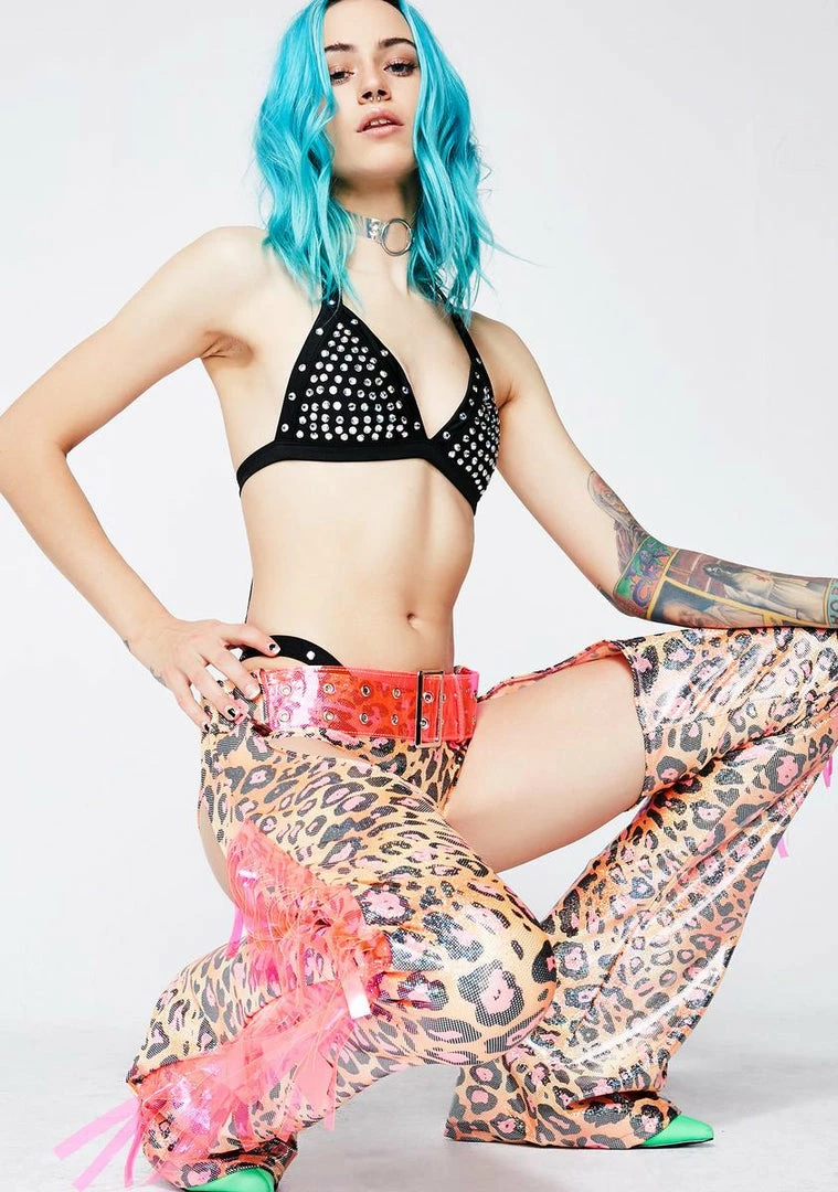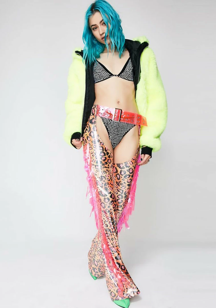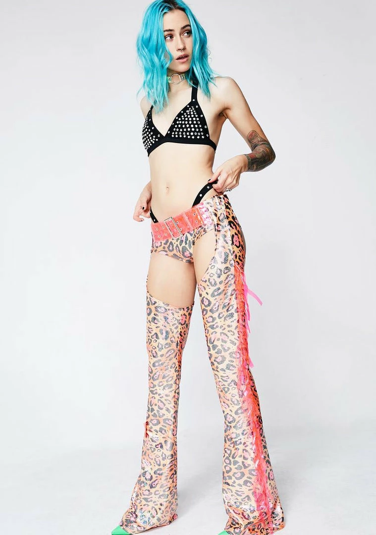 cuz ya ready to get down with ya bad self. Get wild in these iridescent chaps with a leopard print all ova, vinyl fringe detailz on the sides, matching booty shorts, and a buckle closure.