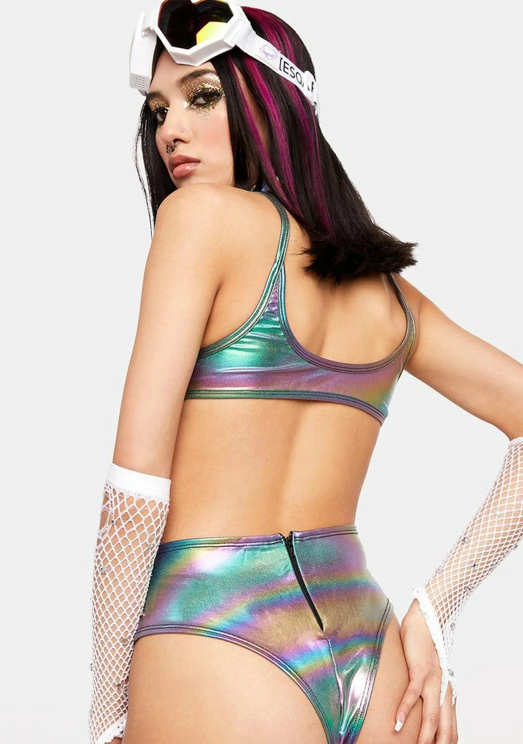will have you feeling bliss! These high waist booty shorts have a stretchy spandex construction, an oil slick metallic shimmer, a thong back, and a zipper closure.