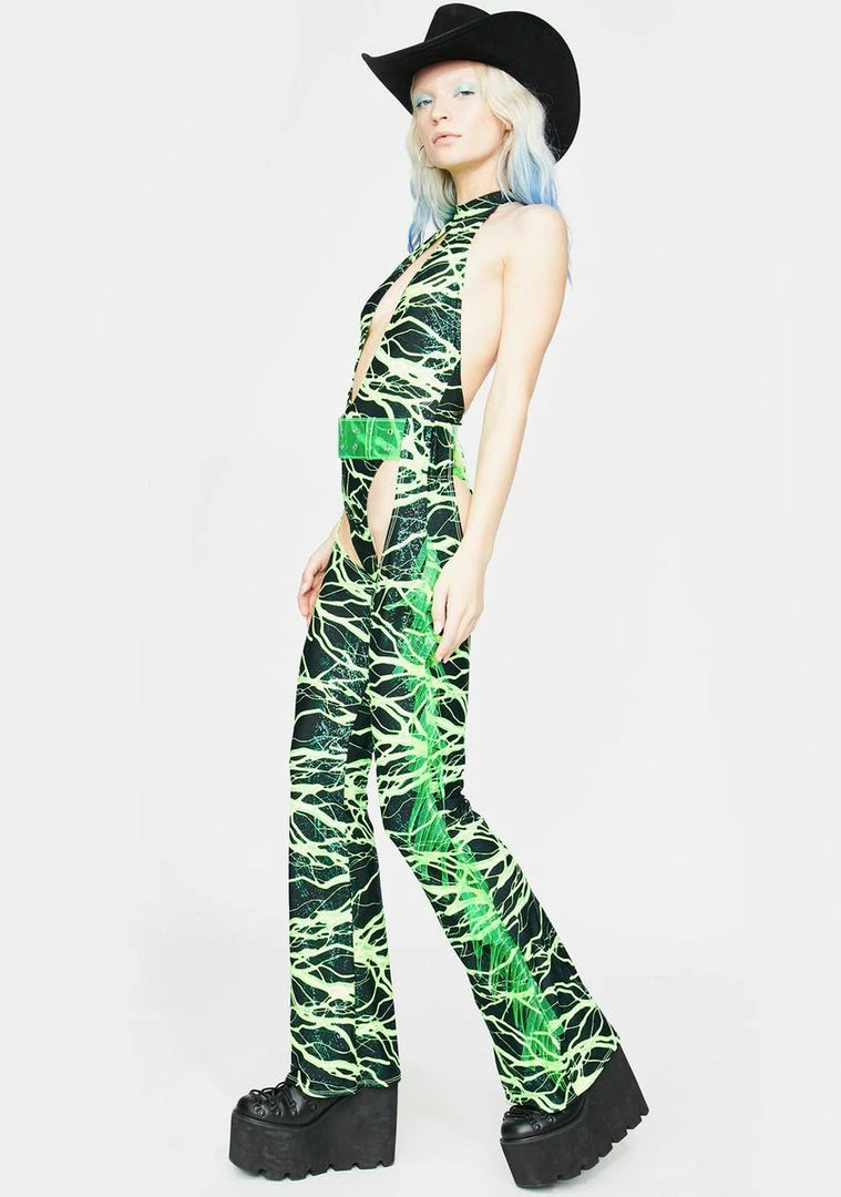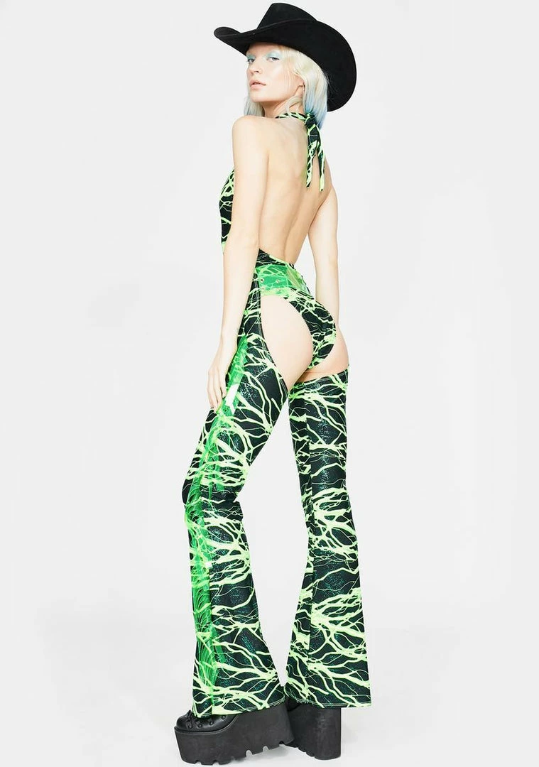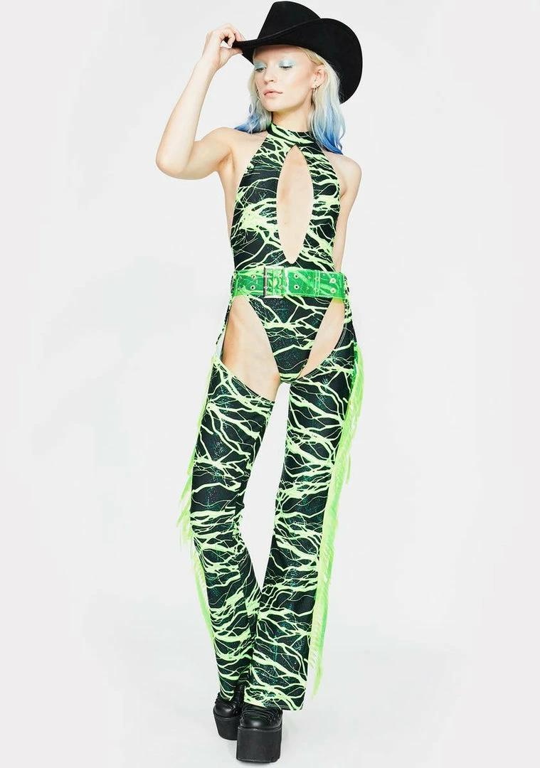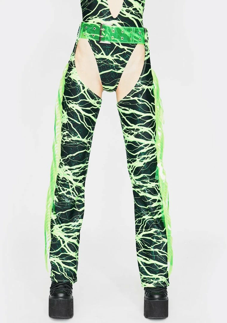 cuz you always shock Γ’ΒΒem. These neon green vinyl belted chaps have matching fringe trim and a lightning print all ova.