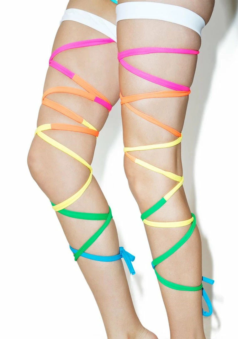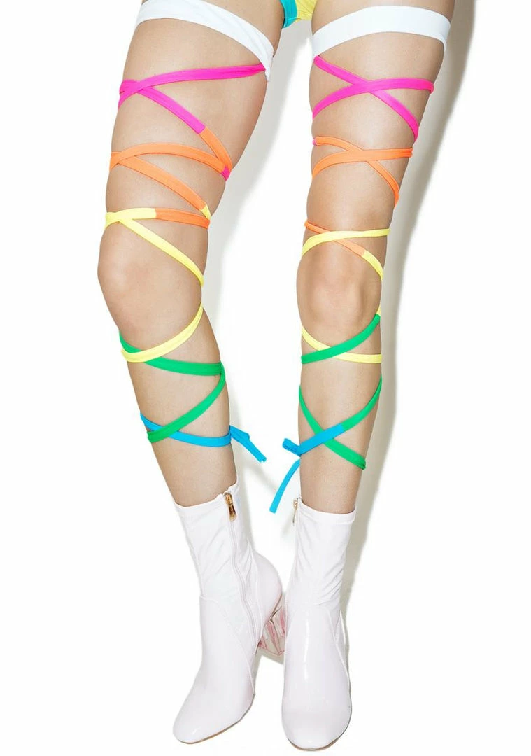 cuz its time to wrap ya self up in da rainbow. This stunning set of two leg wraps are constructed from a neon multicolored material that twist, wind Γ’ΒΒN tie around yer legz with an attached supa stretchy elastic thigh garter.