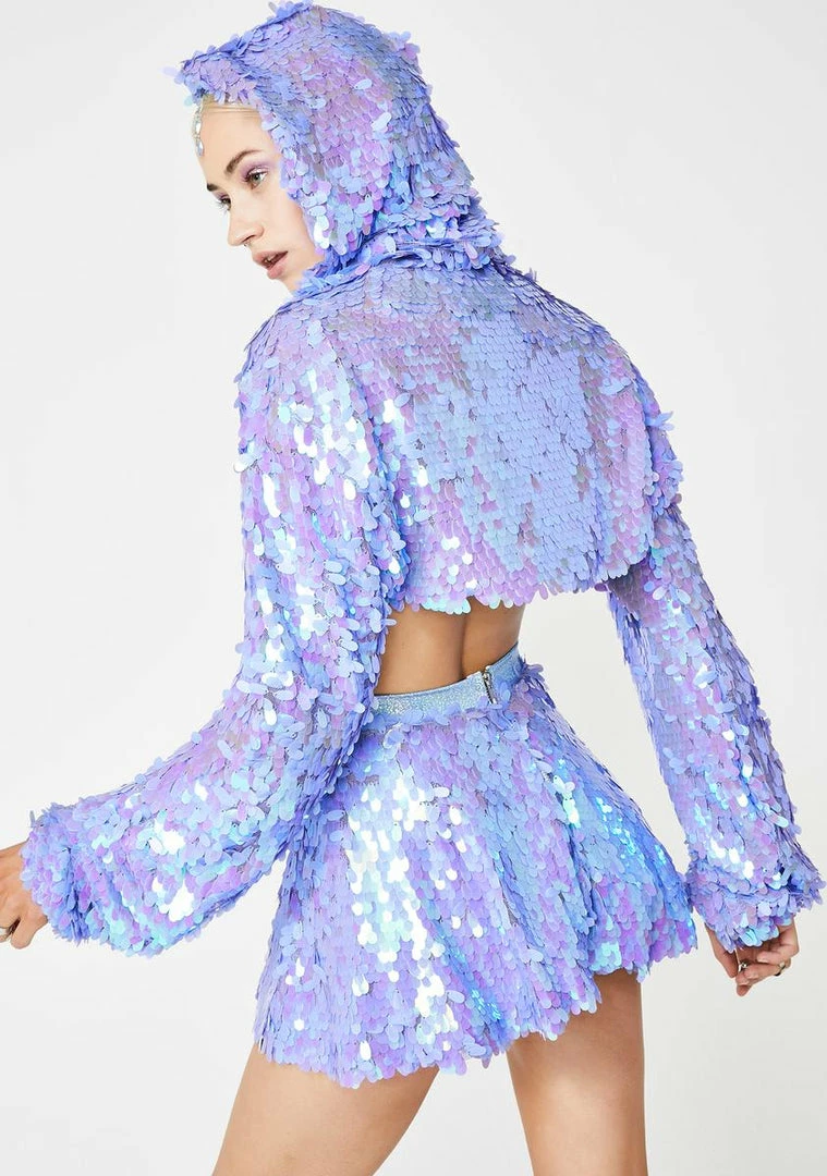 will have ya glowinΓ’ΒΒ on the dancefloor babe! Do more than just sparkle in this hooded shrug that has a hologram sequin construction, an open front, and different light up modes. WARNING: May Cause MOOP!