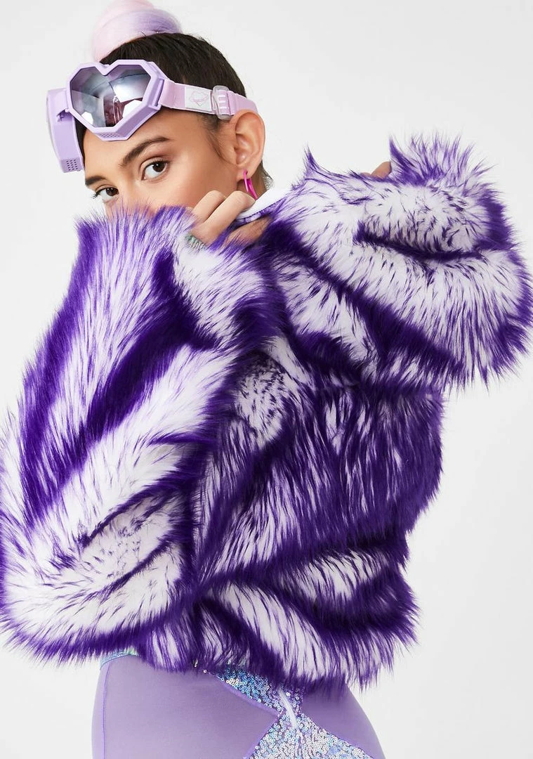 yew bring da light in da night, bb. This jacket features a purple faux fur construction, cropped length, zipper front closure, and hidden battery packs that switch on tonz of lights inside so yew stay lit all night long.