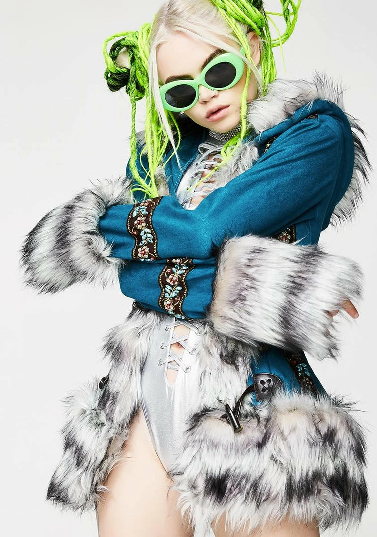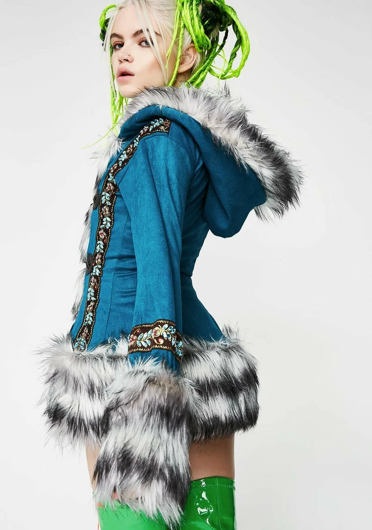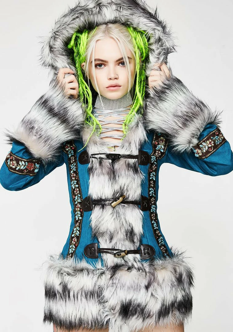 will keep ya cozy NΓ’ΒΒ cute! This teal blue jacket has black NΓ’ΒΒ white faux fur trim and three toggle closures on the front.