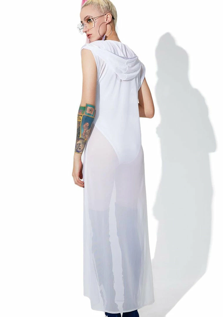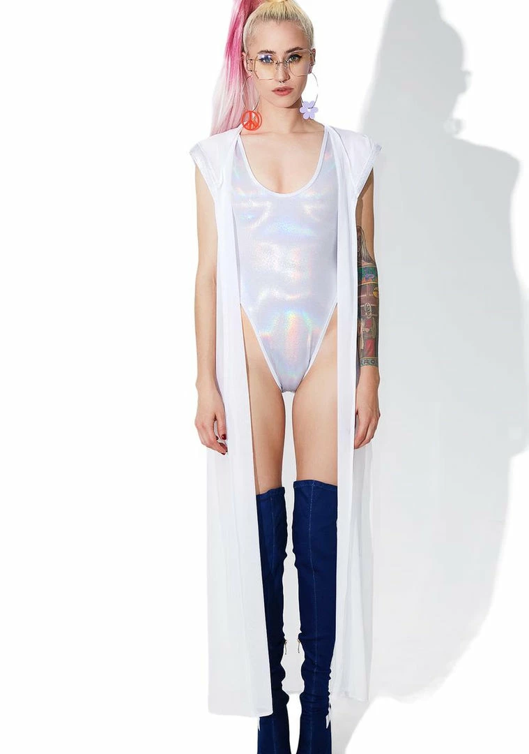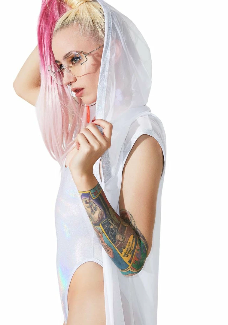 a long time ago, in a galaxy far far away…you were still lookinΓ’ΒΒ sikk af! Take it to the far reaches of the universe in this sweet duster featuring a sleeveless sheer construction and silver holographic trim around the hood and arm holes.