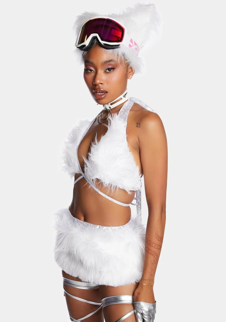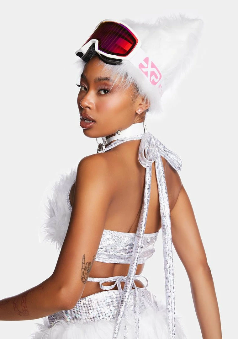believe the hype. This bra top has a holographic material, a halter neck and wraparound waist ties, faux fur bra cups with interior string lights that turn on and off via dual battery packs hidden at the back.