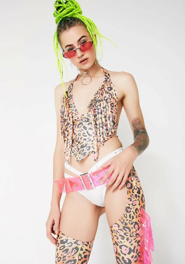 cuz youΓ’ΒΒre about to get wild. Pounce on it with this metallic halter crop top that has a v neckline with a fringe trim, a leopard print all ova and tie closures.