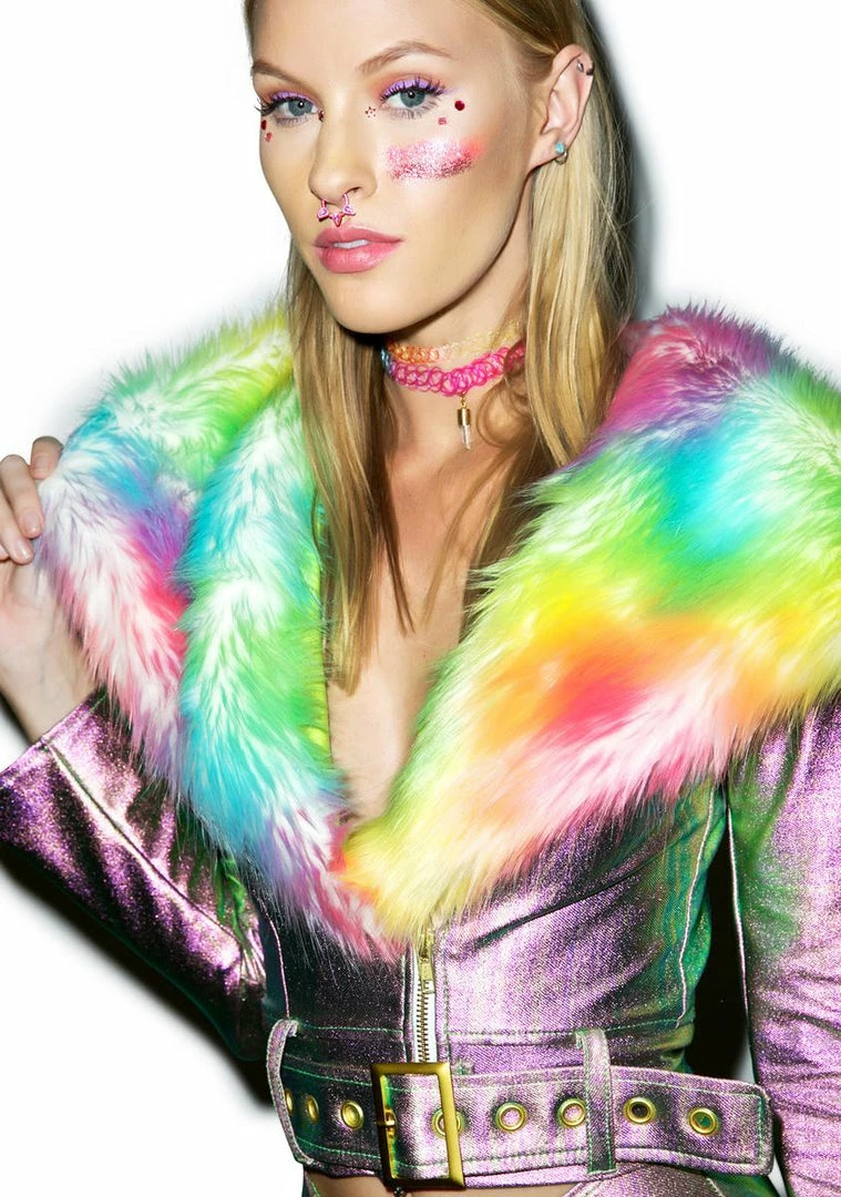 is ready to rage on a rainbow. This trippy long sleeve moto jacket is made from a gorgeous ultra smooth metallic material that shimmers iridescent colors with every movement. Featuring an exaggerated collar covered in fab fluffy rainbow colored faux fur, cute cropped hemline and front zipper closure with adjustable belt.