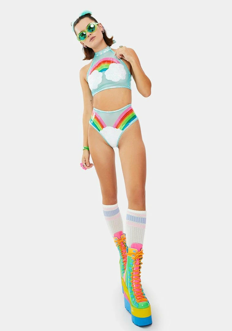 because youâre always in their dreams. These high waisted booty shorts have a glittery finish, stretchy fit and rainbow graphic on the front.