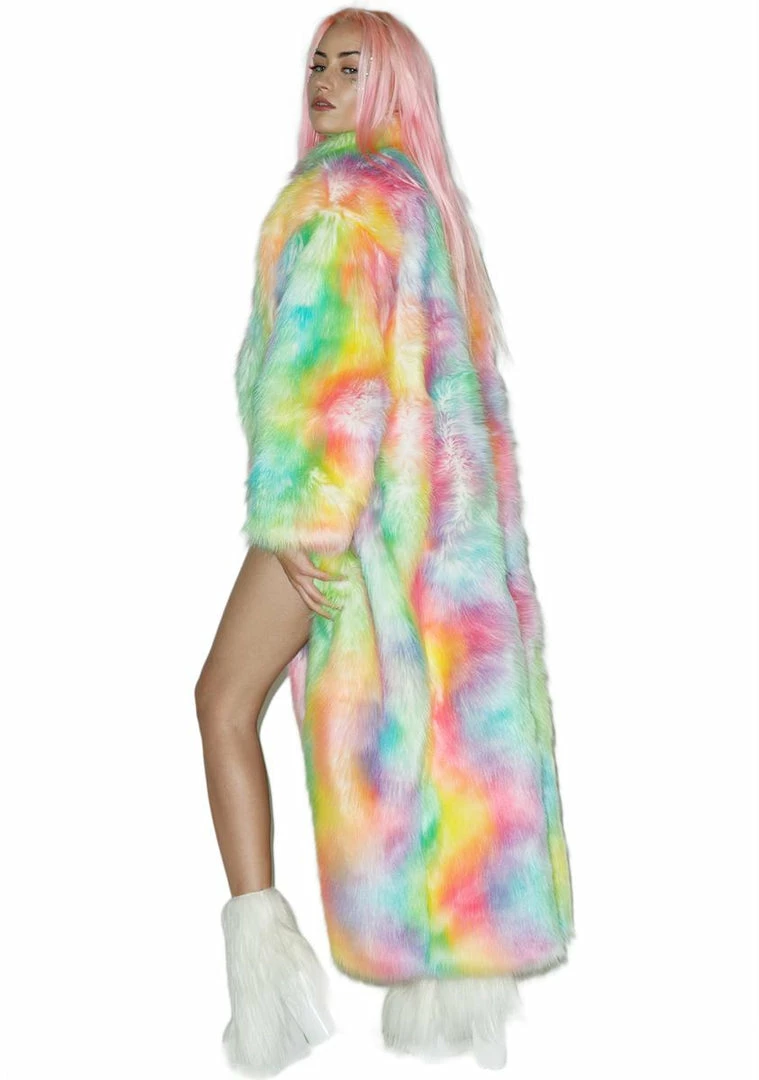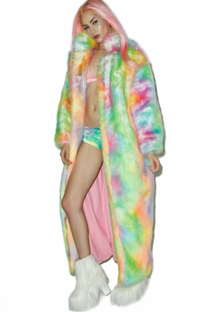 get waaay up and over that rainbow in da sky, and light up any room! This showstopping made in the USA long sleeve coat will give you and everyone around ya major PLUR vibes, especially with the interior string of mesmerizing LED lights running throughout that has 2 dazzling settings, solid and flashing. FeaturinΓ’ΒΒ multiple battery packs hidden inside the lining and the prettiest rainbow swirled fluffy faux fur surrounding yer body with a dramatic full length hemline.