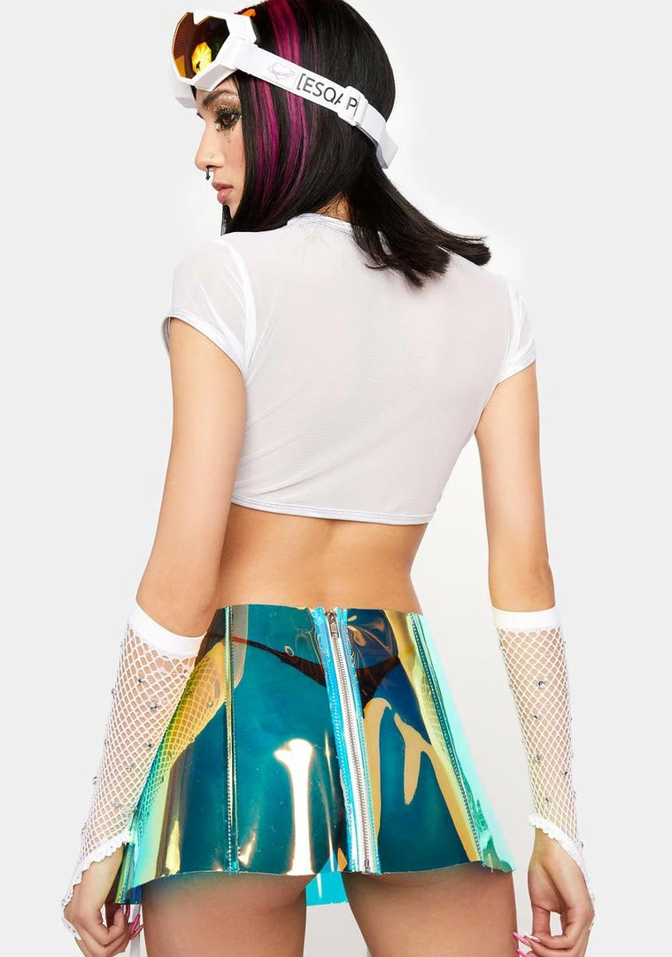 cuz you’ve got the magic! This structured mini skirt has a holographic vinyl construction, a high waist fit, contrast lace-ups on the front, and a back zip closure.