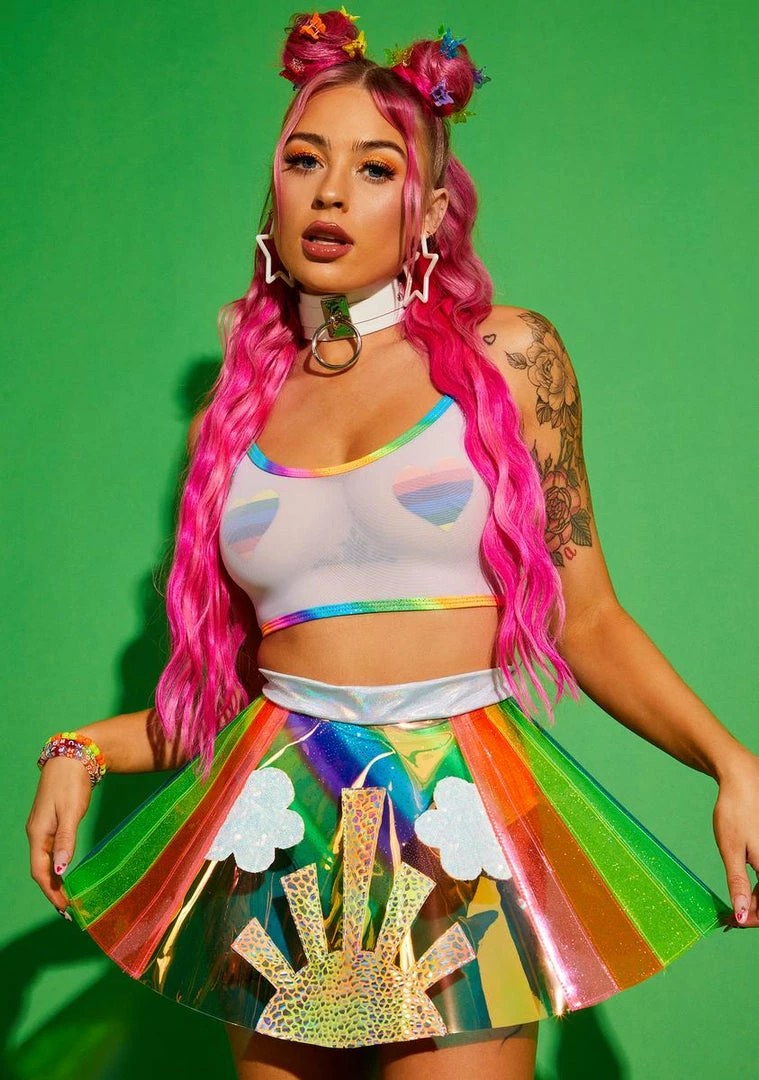 cuz youΓ’ΒΒre the sunshine of their lives, babe! This mini circle skirt has a rainbow glitter vinyl construction, a back zip closure, and a sun and clouds design on the front.
