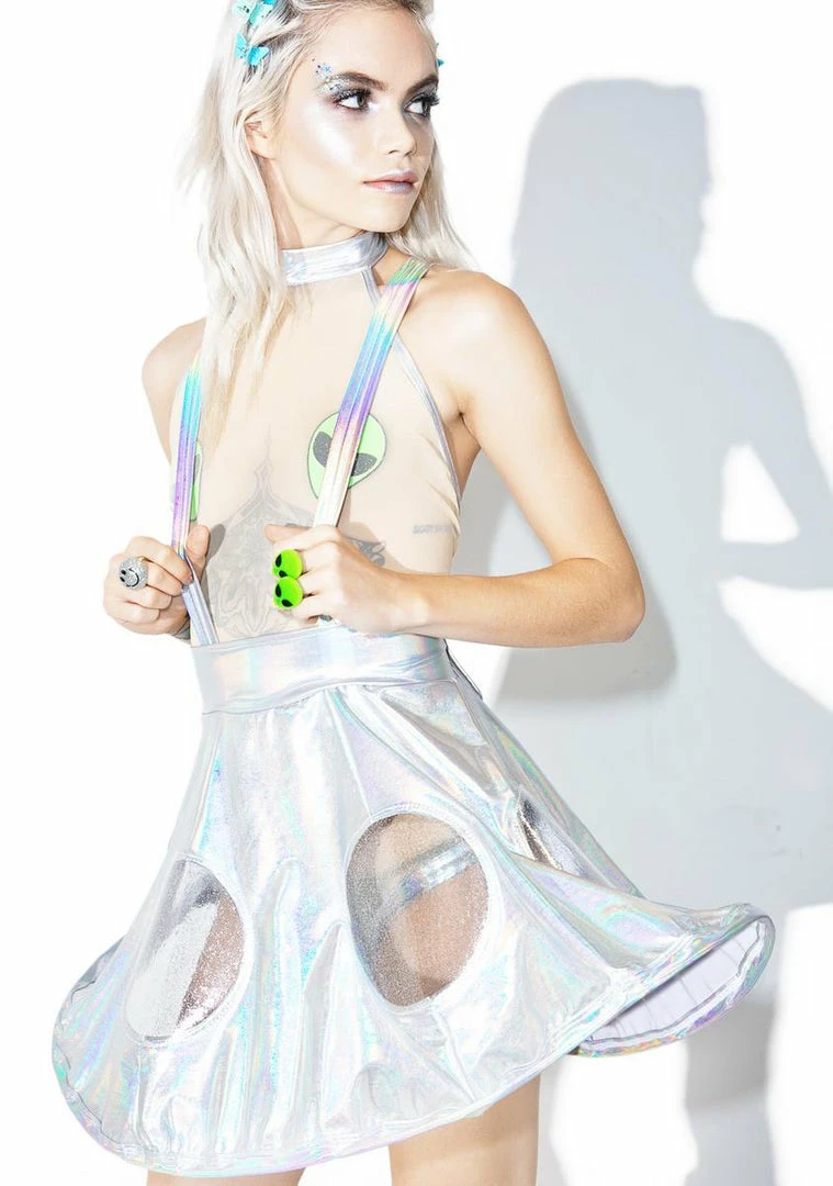 yer vibe is alwayz interstellar, bb. This spaced out costume set is all ya need to transcend into da next galaxy with its sexXxy sheer halter bodysuit and cute âlil alien pasties to provide barely there extraterrestrial coverage. Featurinâ a fabulous holographic structured like a spaceship skirt with see-thru windows to yer rockinâ bod, yer ready for blastoff.