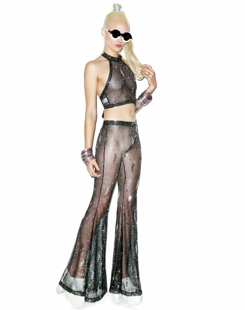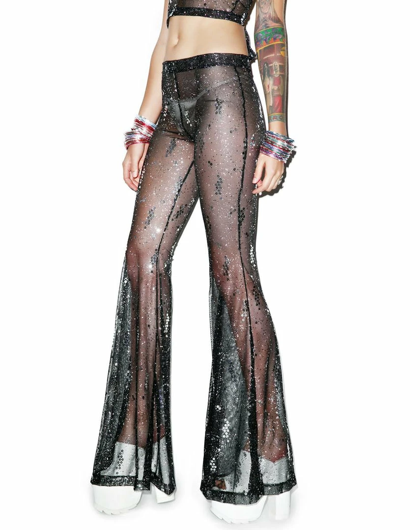 J Valentine Starry Sequin Mesh Bell Bottoms, show ΓΒem what yer workinΓΒ with! These groovy sheer bell bottom pants are covered in sequins and glitter that will make u shine brighter than anyone else on the dance floor, and feature a wider waistband to keep ya more comfy while ya wiggle yer goods. Made outta a flattering stretch fabric to hold all yer bits in place, ya can get yer saturday night fever as hott as ya can handle.