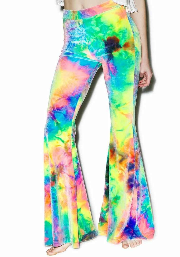weâre always seeinâ sounds when yer rockinâ out nearby, bb! Give âem somethinâ to talk about in these incredible high waisted bell bottoms, featuring an ultra stretchy ân curve hugginâ fit, banded waist, rainbow tie-dyed velvet construction, and exxxtra big flares so they can see yer moves from miles away!