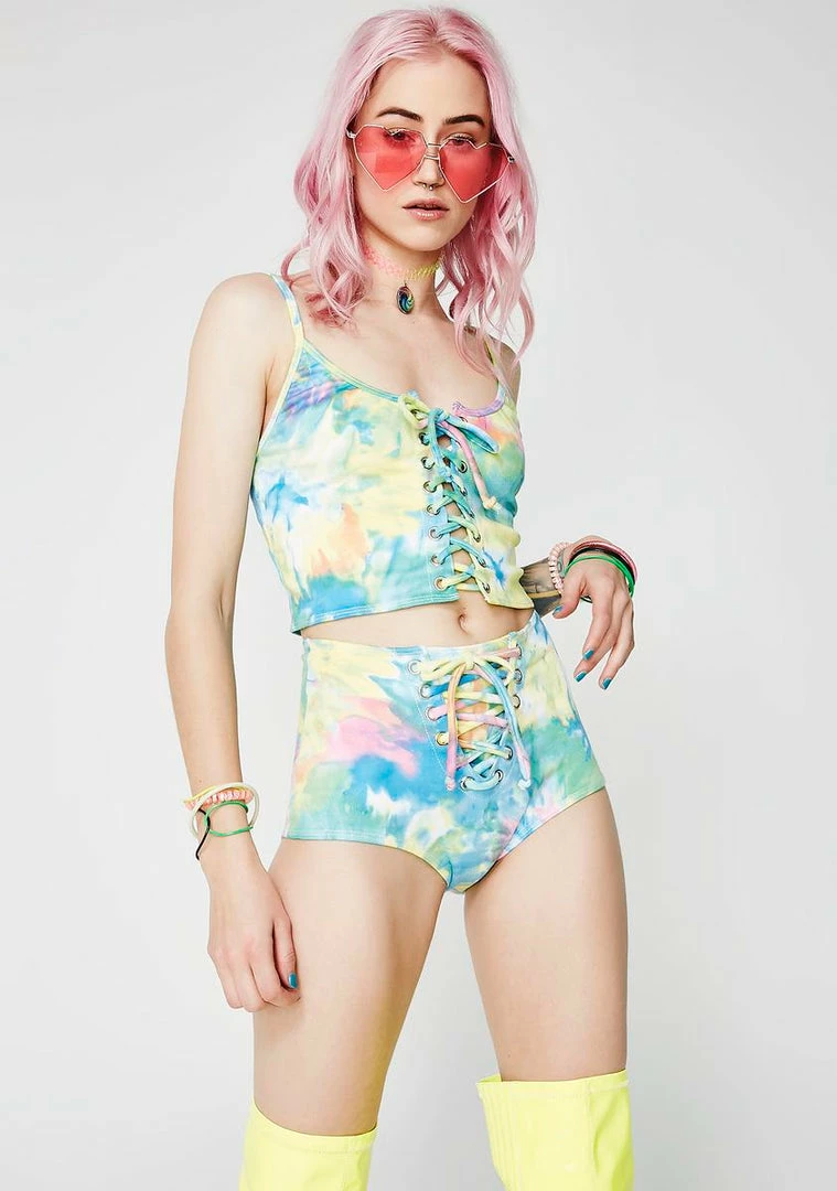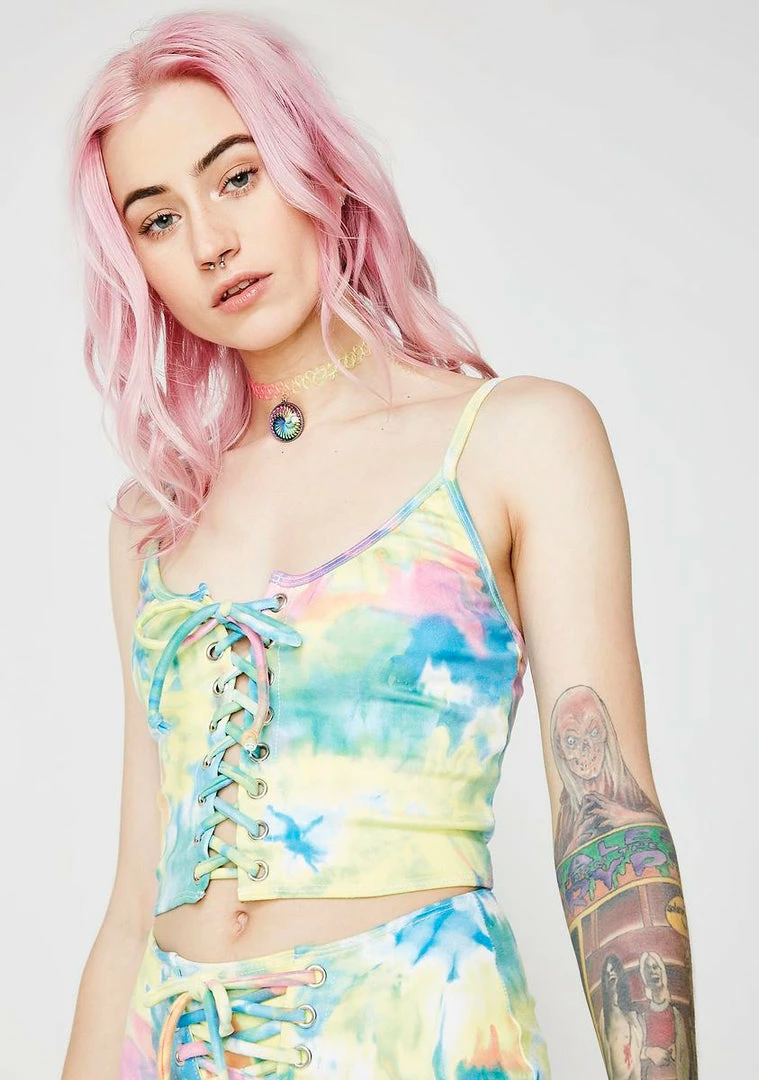 got ya trippinâ out! This lil tank has a cropped length, a front lace-up, skinny straps, and a colorful tie-dye print.
