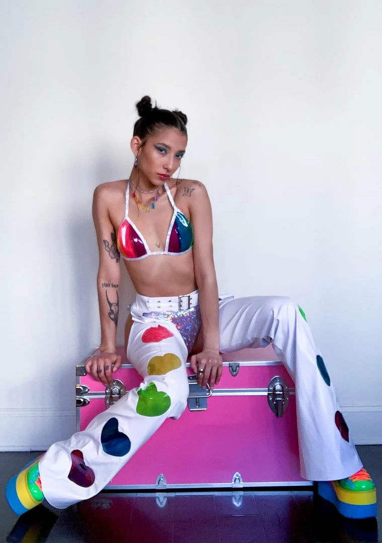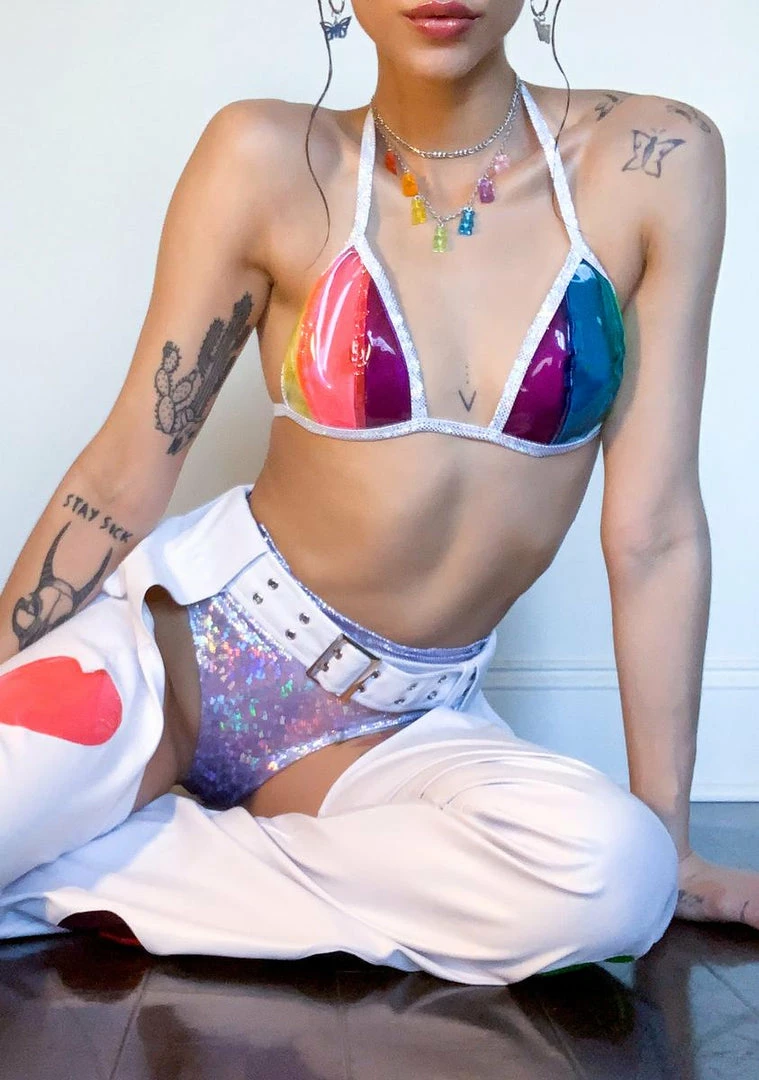 gotcha tearinΓ’ΒΒ up the dancefloor, bb! Taste the rainbow in this funky triangle bikini top that has a sheer vinyl construction with a striped rainbow print and adjustable string tie closures.