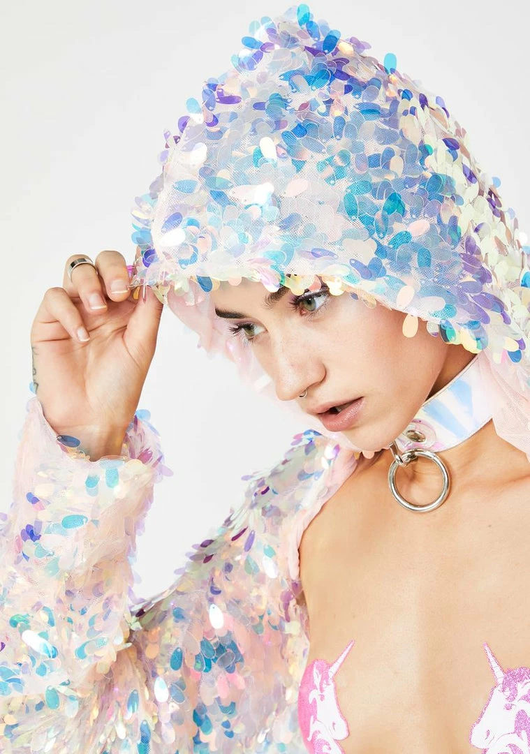 will have ya glowinâ on the dancefloor babe! Do more than just sparkle in this hooded shrug that has an opalescent hologram sequin construction, an open front, and different light up modes. WARNING: May Cause MOOP!